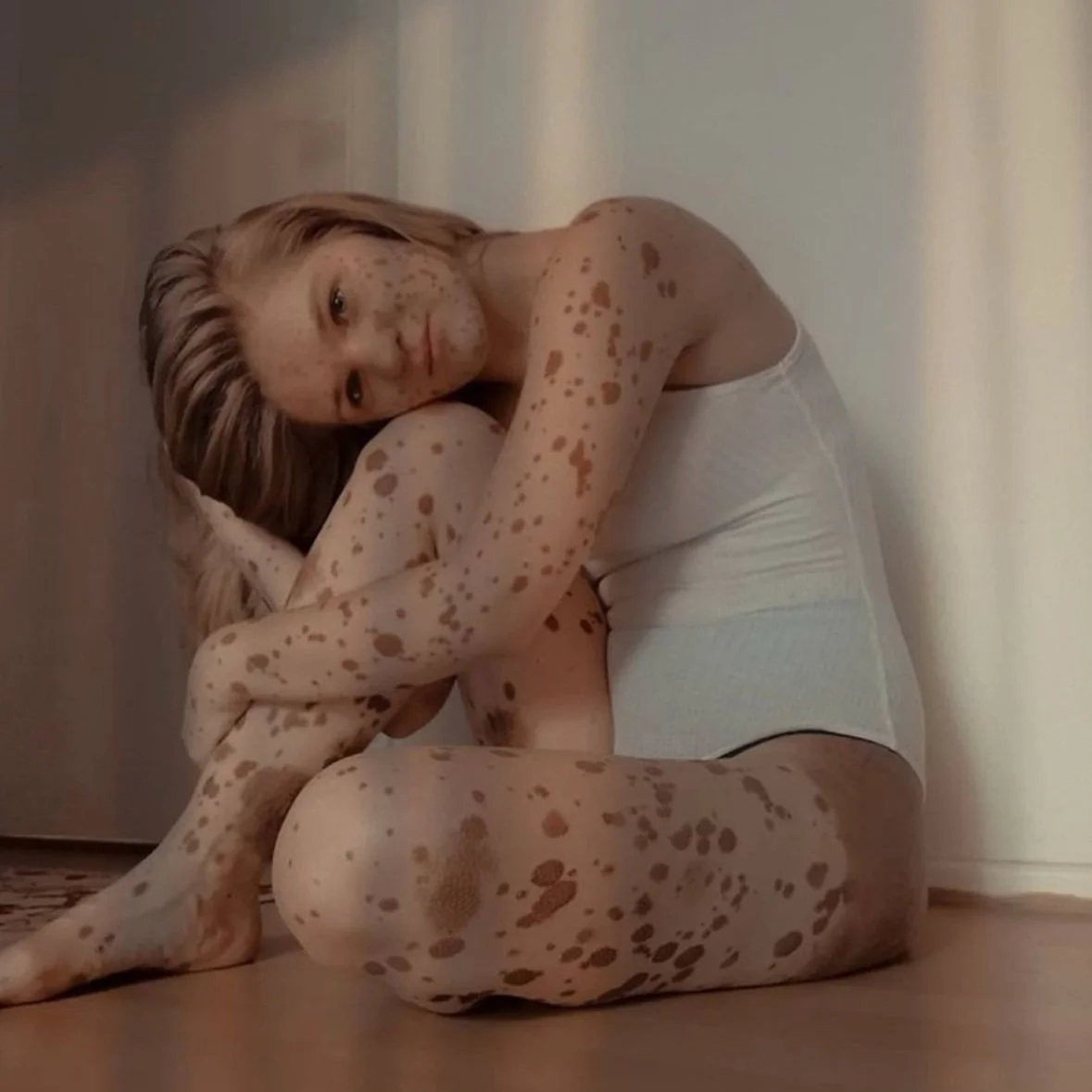 ID: Marika poses on the ground, hugging one knee with her arms. Her head is tilted and resting on her upright knee, and looks pensively off camera. Her body is covered with little dots and patches of pigmentation.