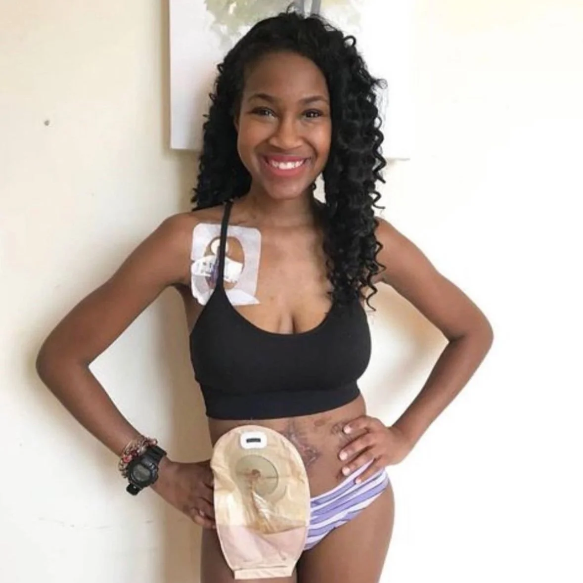 ID: (photo 1) Aeisha poses with her hands on her hips and smiles into the camera. She wears a black bra and purple/white undies, with her osteomyelitis bag visible.